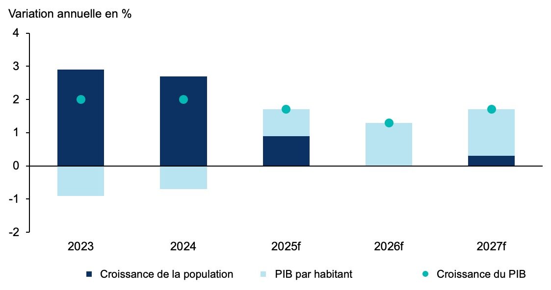 La faiblesse du PIB par habitant au Canada a retenu l’attention ces dernières années, en particulier si on le compare à celui des pays du G7 et de l’OCDE. Bien que cela représente un progrès, l’écart devrait persister. Le ralentissement de la croissance démographique, qui reflète les modifications des objectifs fédéraux en matière d’immigration, aura un impact négatif sur la consommation et la croissance du PIB : l’économie canadienne devrait croître d’environ 1 % en 2026. Par conséquent, cet élément clé du niveau de vie pourrait connaître une légère progression en 2026, même si l’économie dans son ensemble continue de tourner au ralenti.