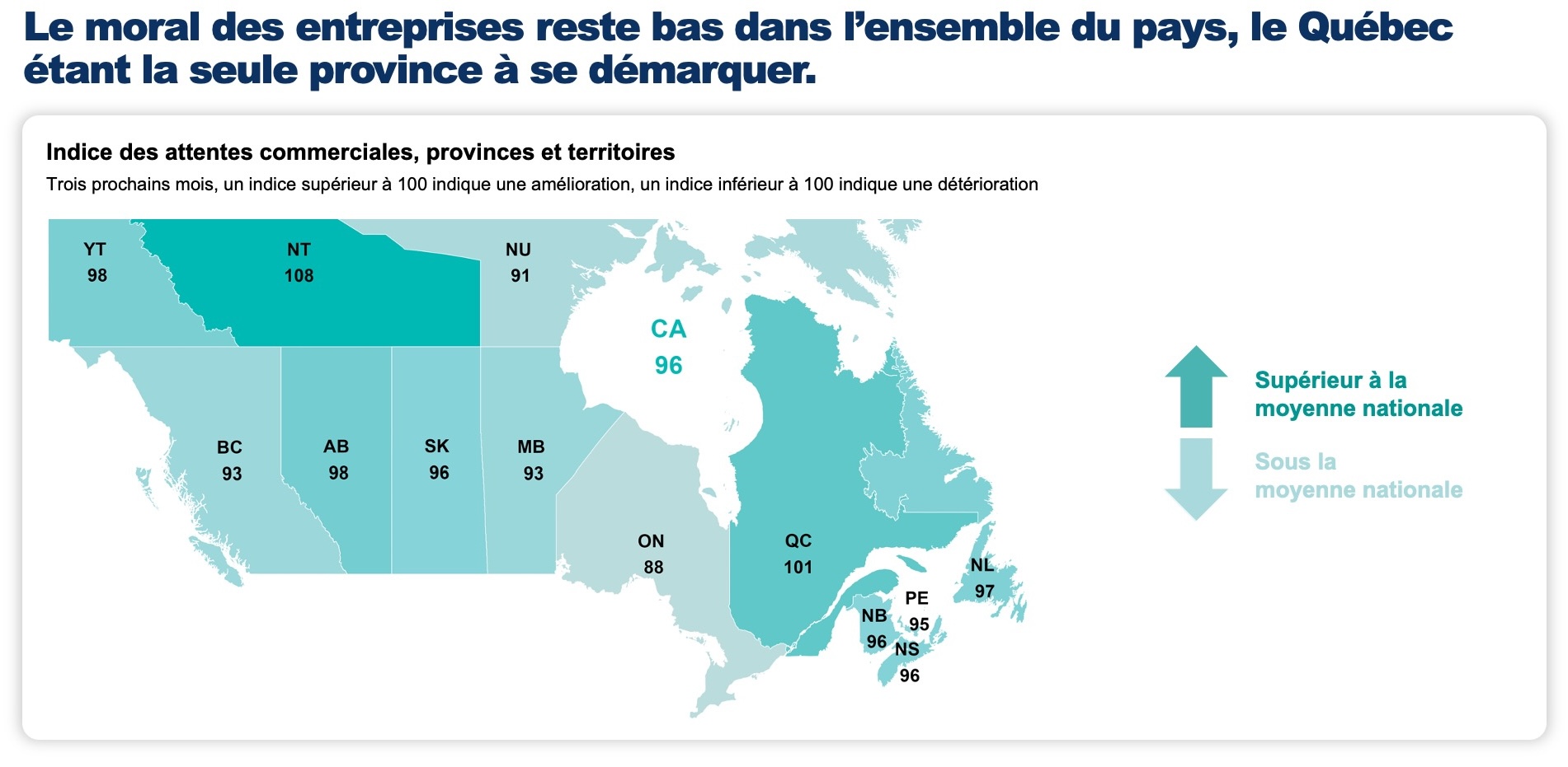 C’est en Ontario que le moral des entreprises est le plus faible et, sur douze mois, c’est le long du corridor commercial de l’Ontario que le recul le plus marqué a été enregistré par rapport au reste du Canada.