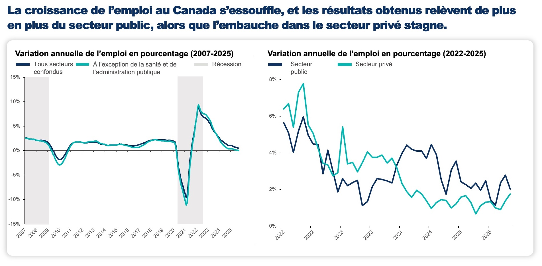 La croissance de l’emploi au Canada s’essouffle. Les gains d’emploi annoncés ne reflètent peut-être pas fidèlement la dynamique sous-jacente des affaires. En effet, l’embauche dans le secteur privé a fortement ralenti, les gains les plus récents étant enregistrés dans le secteur public.