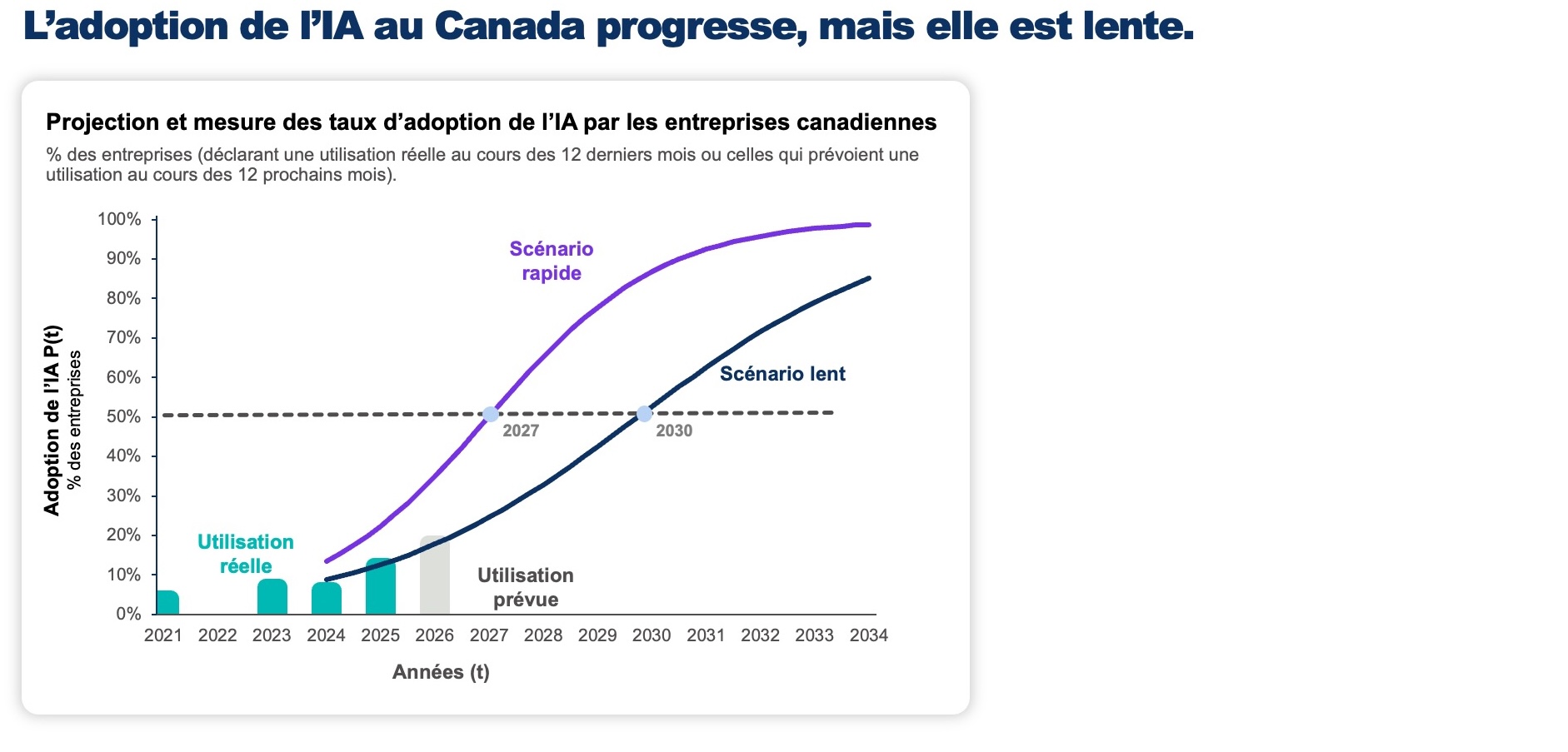 En 2024, le LDE prévoyait que l’adoption de l’IA par les entreprises canadiennes atteindrait un point d’inflexion de 50 % au cours des trois à six prochaines années, en se basant sur un scénario d’adoption rapide ou lent. Selon les données de 2025 de Statistique Canada, l’adoption semble suivre la projection basée sur un taux d’adoption lent formulé par le LDE.