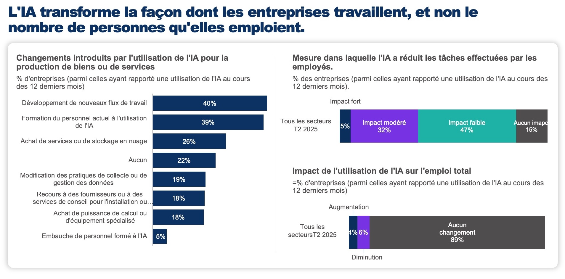 L’IA fait évoluer la façon dont les entreprises travaillent, pas le nombre de personnes qu’elles emploient. Parmi les entreprises qui déclarent avoir utilisé l’IA au cours de la dernière année, 40 % disent l’avoir utilisée pour développer de nouveaux flux de travail, 39 % ont formé le personnel actuel à l’utilisation de l’IA et 19 % ont modifié les pratiques de collecte ou de gestion des données. La plupart des entreprises (89 %) ont déclaré que l’adoption de l’IA n’a pas modifié leur effectif total et seules 5 % d’entre elles affirment que l’IA a réduit considérablement les tâches effectuées par les employés.