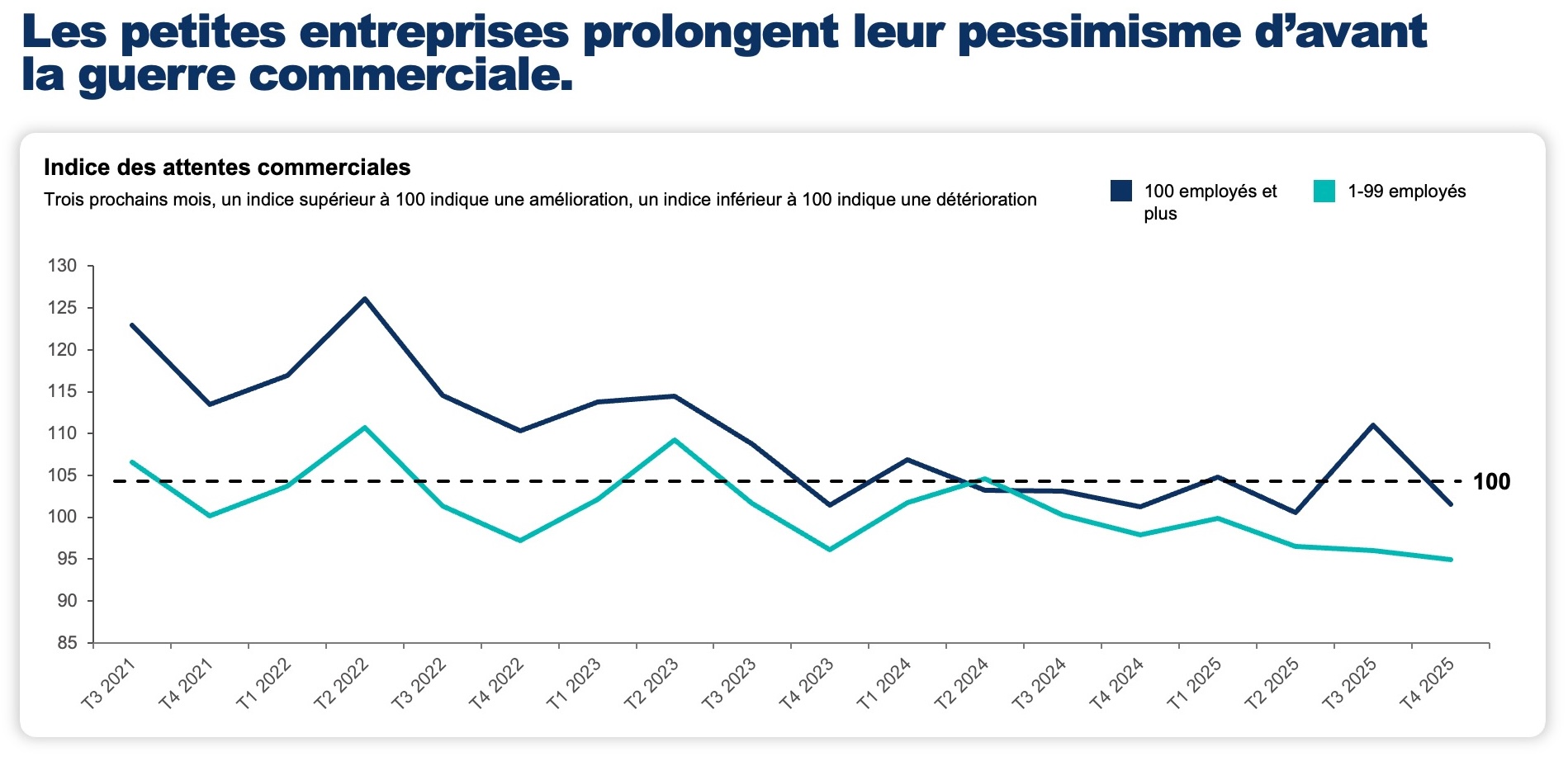 Les petites entreprises de 1 à 99 employés sont moins optimistes que les entreprises de plus de 100 employés.