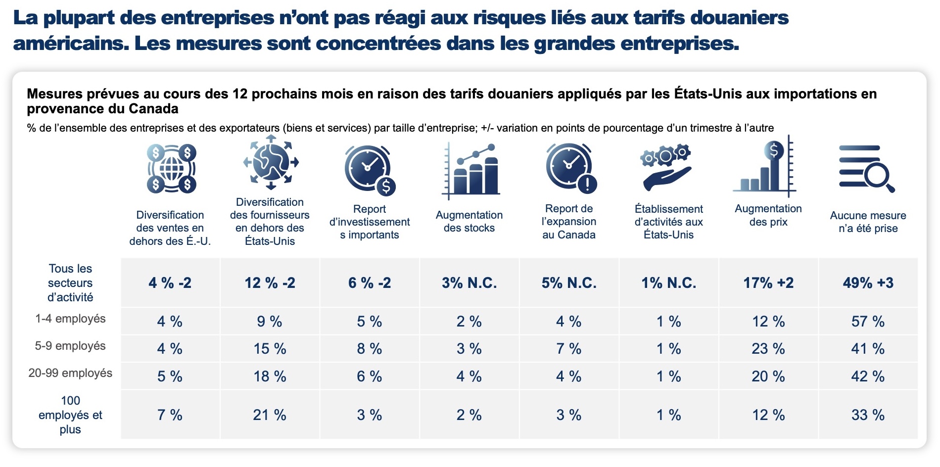 Dans un contexte d’incertitude et de stagnation de l’économie (malgré des manchettes sur le PIB quelque peu optimistes), les entreprises s’adaptent, avec prudence. Les industries tributaires du commerce passent en mode « attente ». La plupart des entreprises, en particulier les plus petites d’entre elles, n’ont pas adopté de mesures significatives au-delà d’ajuster les prix, ce qui suggère que les décisions relatives à la diversification et à l’investissement seront sans doute encore retardées jusqu’à ce que les politiques soient plus claires. Parallèlement, l’adoption de l’IA est en hausse, mais les données suggèrent que nous avançons à pas de tortue.