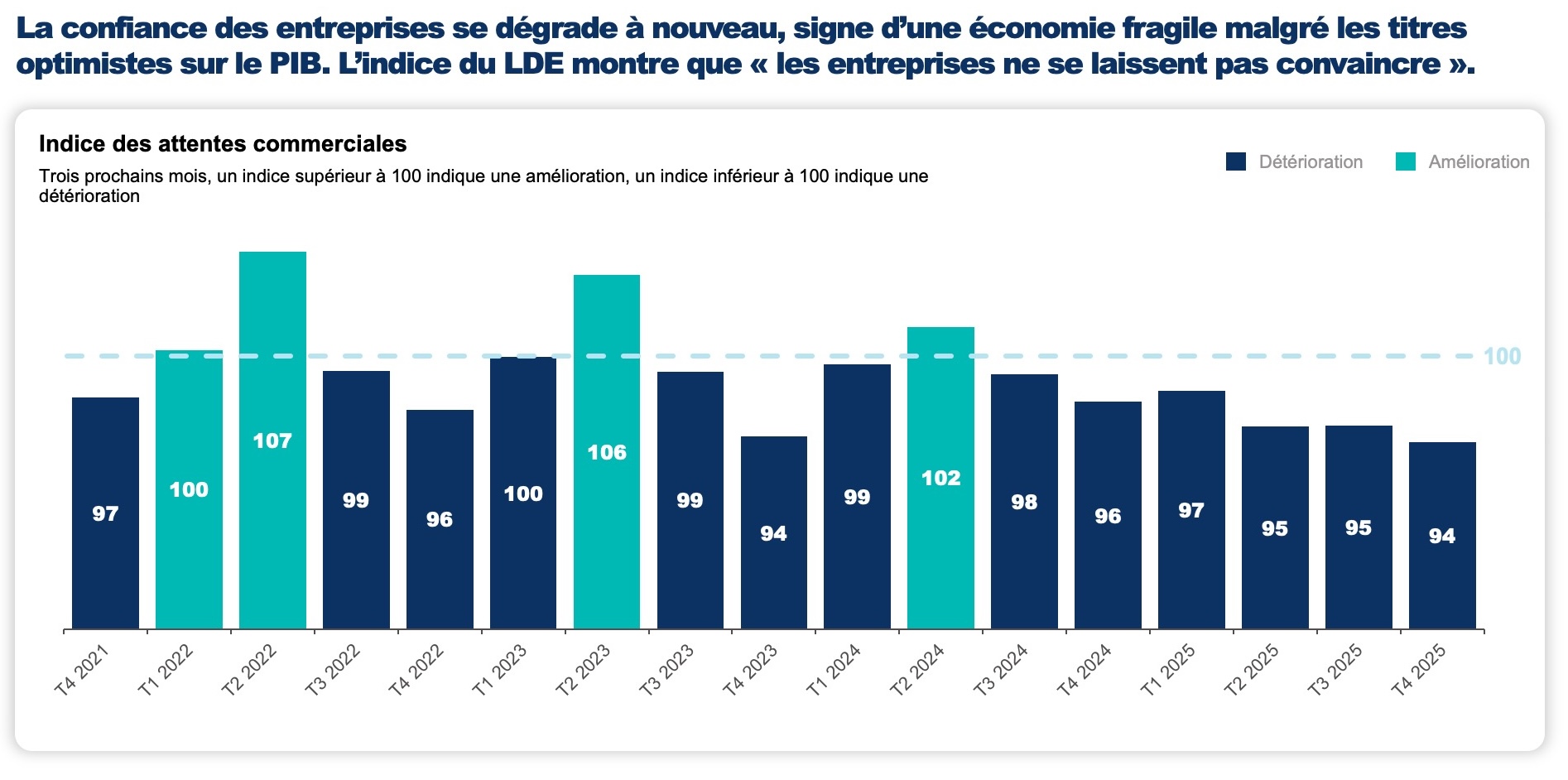 La confiance des entreprises s’effrite à nouveau, signe d’une économie fragile. Le moral des exportateurs de biens et de services a également reculé.