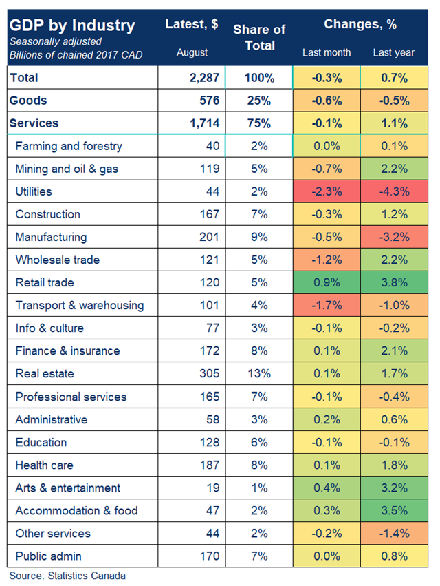 - Real GDP contracted 0.3% m/m in August, led by goods-producing sectors which declined 0.6%, while services were down only 0.1%. This reverses July’s 0.3% m/m GDP growth, as trade-exposed sectors continue a downward trend in August. The goods economy posted its fifth monthly decline since January, signaling broad-based weakness in manufacturing and industrial output.