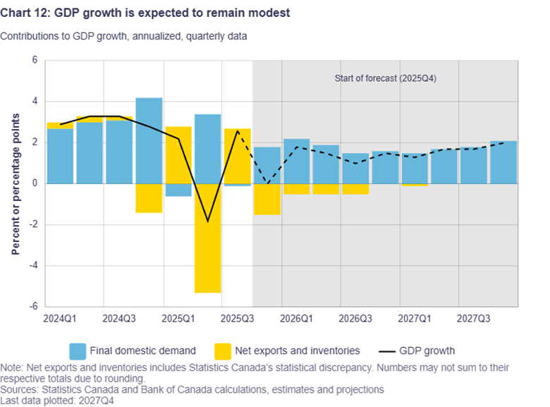 The Canadian economy is expected to grow 1.1% in 2026, following GDP growth of 1.7% in 2025, with the fourth quarter on track to provide a weak handoff. Weaker growth this year will be driven in part by slower population growth.