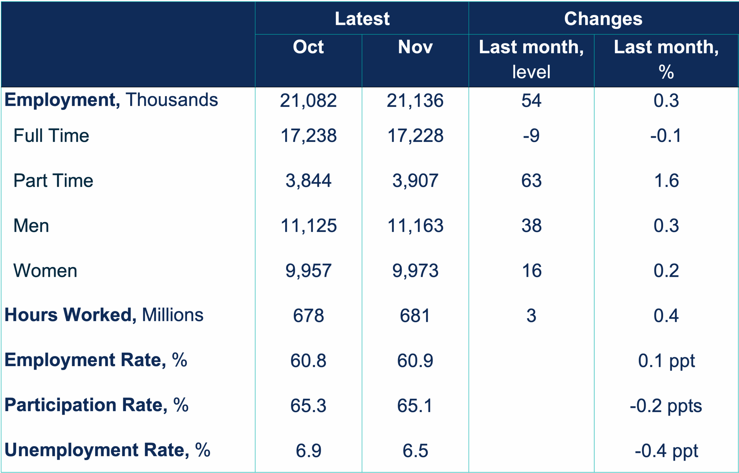 - Employment Levels: Adding to the gains in September and October, net total employment in November is up by 142,000 (+0.7% ytd) from January 2025. In November alone, 54,000 jobs were added, bringing the three-month cumulative increase to 181,000.