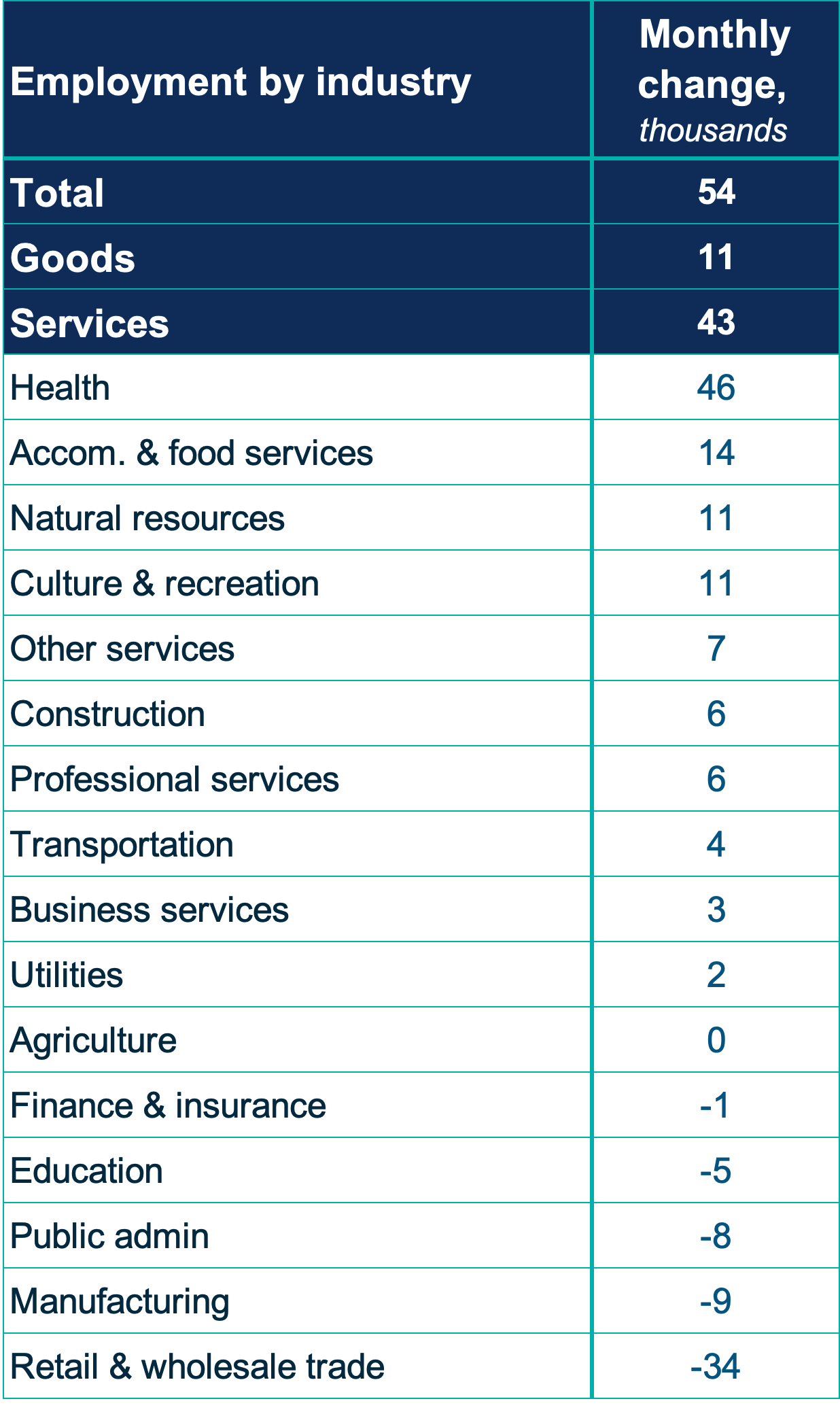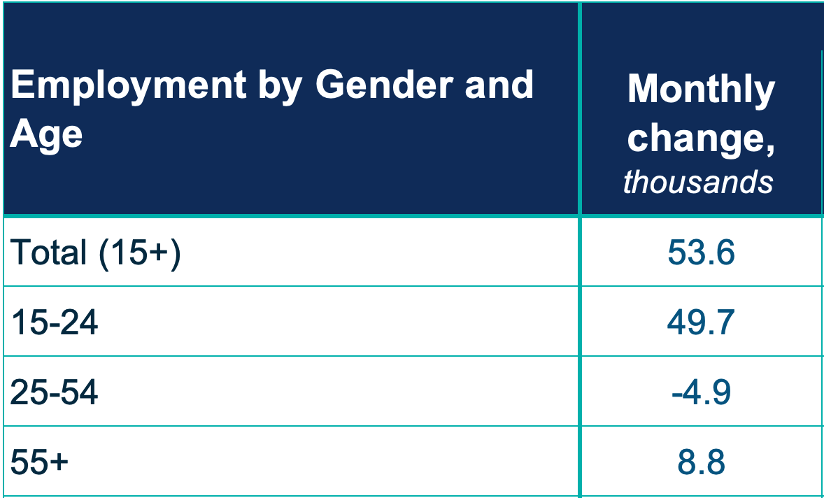 - Sectoral Breakdown: Both goods-producing and services-producing sectors posted employment increases, though the gains were much stronger in services (+43,000) than in goods (+11,000). Year-to-date, employment in goods-producing industries is up 2.9% (seasonally unadjusted), compared with 2% growth in services-producing industries. By sector, health care and social assistance recorded the largest monthly increase, adding 46,000 jobs (+1.6% m/m), followed by accommodation and food services (+14,000) and the natural resources sector (+11,000).