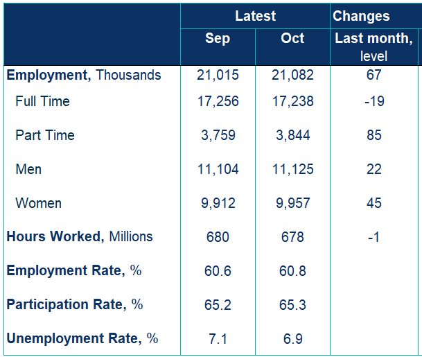 “The cumulative jobs gained (+127,000) in October and September has officially surpassed the cumulative jobs lost in July and August (-106,000). With majority of this gain shared between core-aged men and youth, youth unemployment rate declined by 0.6 percentage points from its all-time high 14.7% to 14.1%.