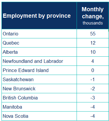 - Sectoral Breakdown: Employment gain is entirely led by service-producing industries, spearheaded by wholesale and retail trade (+41,000), followed by transportation (+30,000), information, culture and recreation (+25,000) and manufacturing (+9,000). Among the losing industries, the construction industry saw the largest decline by 15,000 jobs.