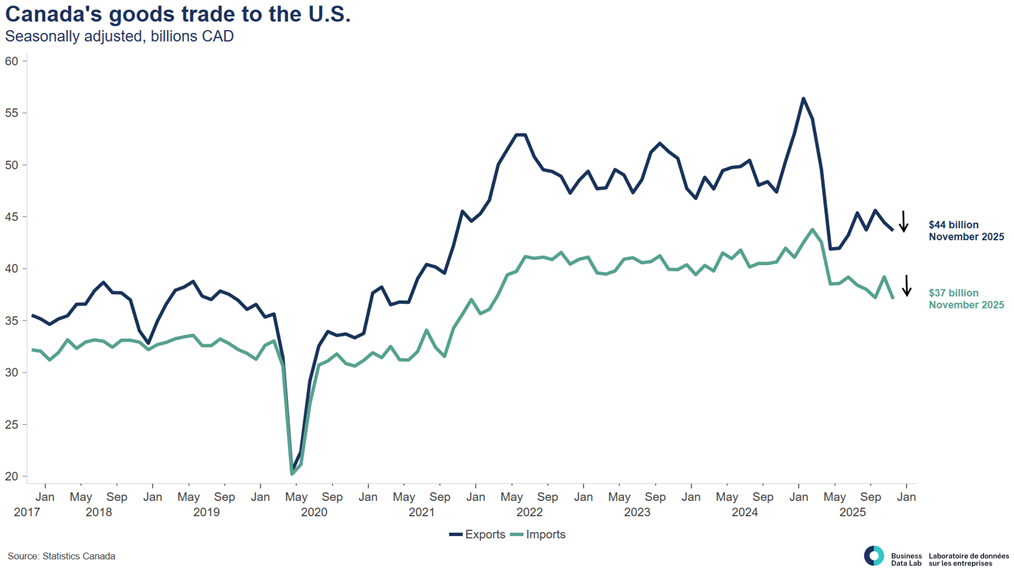 - Energy exports cushioned, but did not reverse, the decline. Energy exports increased 8.5%, driven by higher crude oil and bitumen volumes after temporary U.S. refinery disruptions constrained shipments in October. The rebound helped offset losses elsewhere but largely reflects normalization rather than a renewed uptrend.