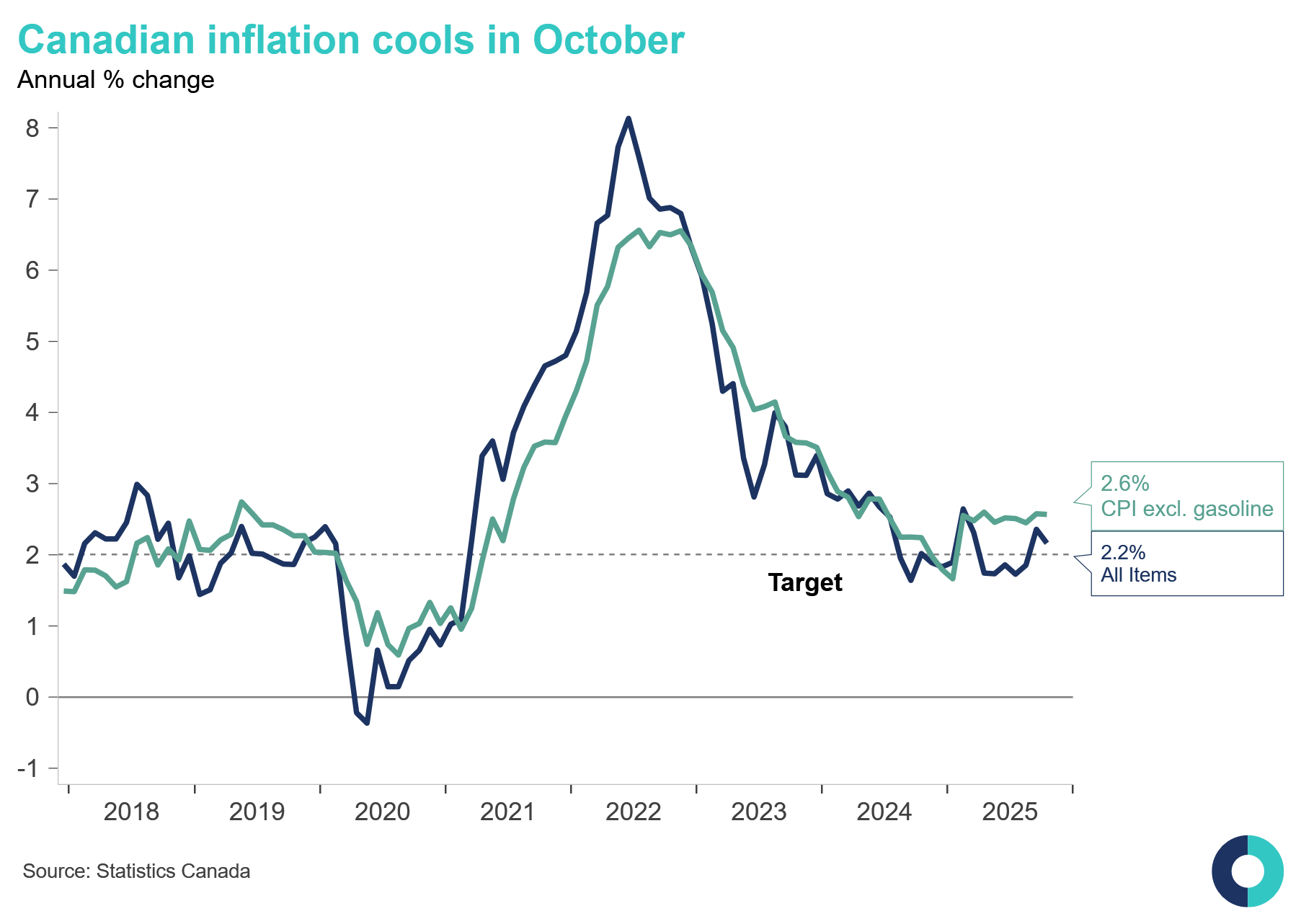 Core inflation remains stable, while headline inflation improved slightly. October’s report adds to a run of more encouraging economic data and supports the Bank of Canada’s decision to keep interest rates on hold. In the absence of significantly weaker economic activity or renewed inflation pressures, the Bank is expected to remain on the sidelines and observe how current monetary policy continues to filter through the economy.