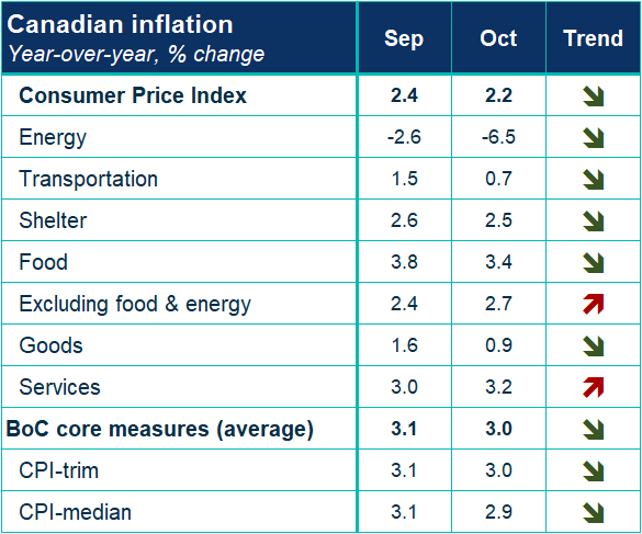 Canada’s inflation rate slowed from 2.4% in September to 2.2% in October, slightly above the Bloomberg consensus of 2.1%.