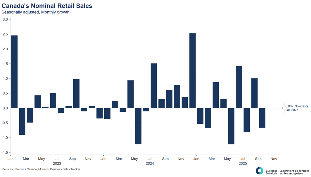 “September’s 0.7% drop in retail sales shows consumers tapping but not slamming the brakes. A pullback in auto purchases drove the decline, while the rest of the picture is far steadier. Excluding autos and gasoline, retail spending was essentially flat, and BDL’s Business Sales Tracker still shows solid year-over-year card-spending growth. Households aren’t retreating; they’re recalibrating. With inflation easing and early-fall job gains holding firm, today’s data points to a consumer adjusting to higher borrowing costs – resilient, but not strong enough to carry the recovery on its own, especially with Stat Can’s flat October flash estimate showing this softer momentum continuing into Q4.”