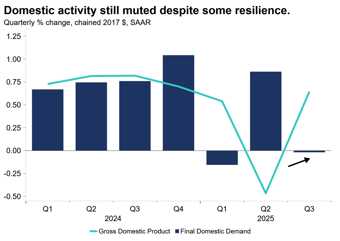 Even with the recent run of encouraging economic data, the Bank of Canada is still unsure about how durable the Canadian economy really is. The Bank is signaling it may be done lowering interest rates as it waits on the sidelines to see if that recent strength persists. Domestic conditions are still sluggish and resilience in some parts of the economy will need to work harder to offset continued weakness in trade-exposed sectors. We continue to expect the Bank to stay in a wait-and-see mode to assess whether these positive trends will hold.