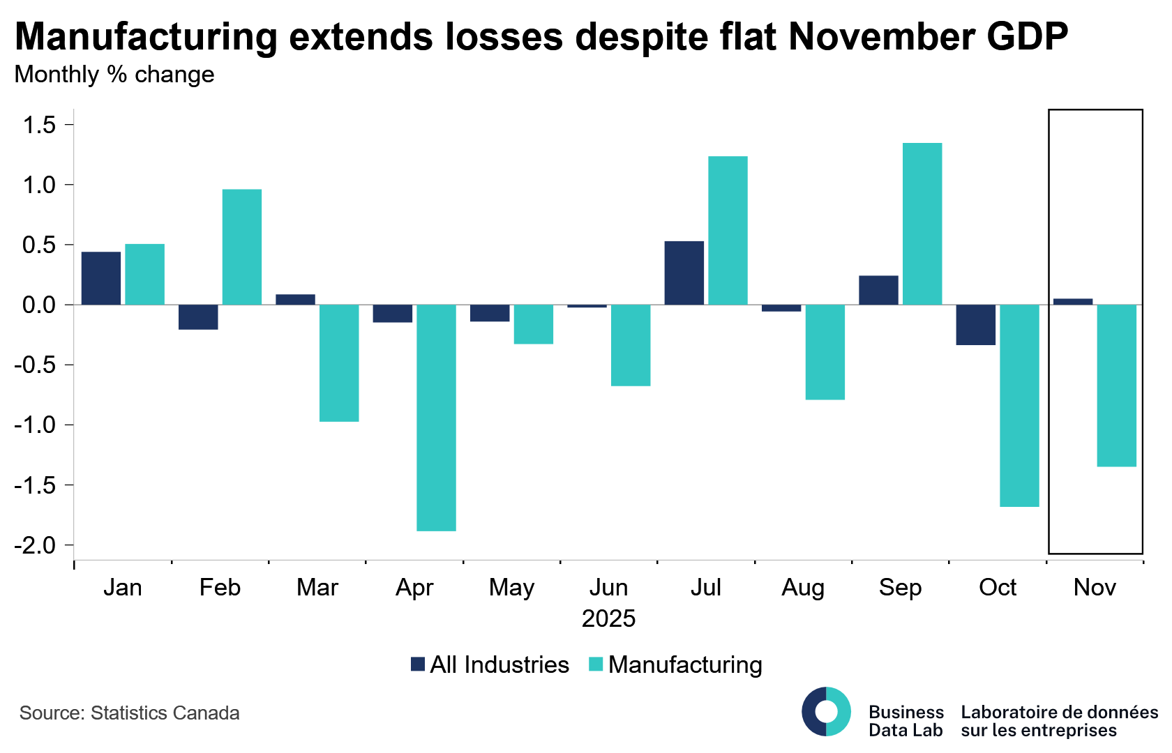 The Canadian economy likely ended the year without momentum to launch into 2026. November GDP suggests the trade war showed accelerated weakness in the manufacturing sector with little rebound in December. With recent export weakness in manufacturing, it is likely this story isn’t over. While today’s GDP report was mixed, overall growth in the fourth quarter now appears likely to come in below both the Bank of Canada’s latest forecast and BDL’s nowcast.