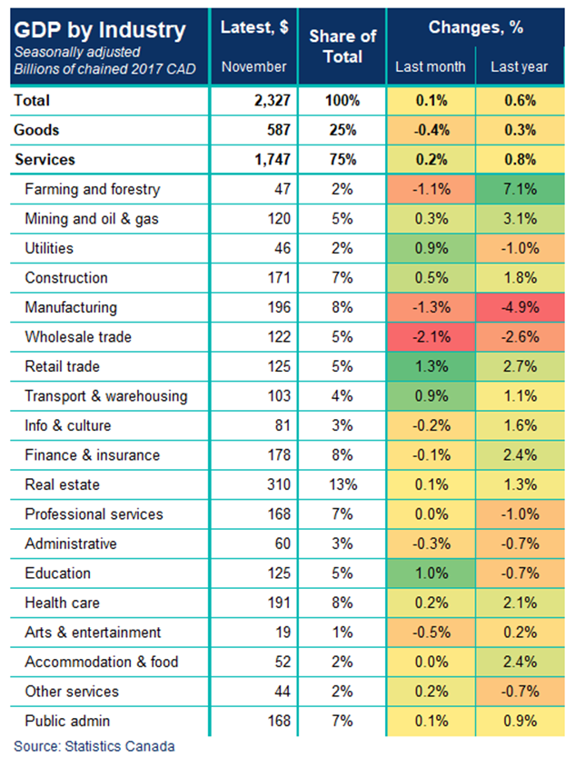 Real GDP was unchanged in November providing no relief to the Canadian economy following a -0.3 contraction October.
